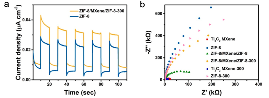 Fig 6. (a) ZIF-8 和 ZIF-8/MXene/ZIF-8-300 的瞬態光電流響應。(b) 在 0.5 M Na2SO4(pH≈7)溶液中模擬陽光照射下測量的 EIS 光譜的奈奎斯特圖。