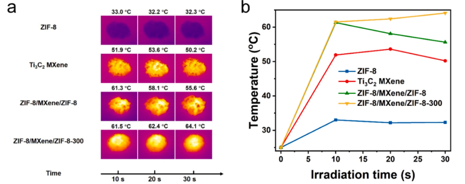 Fig 7. 模擬太陽光照射下 ZIF-8、Ti3C2 MXene、ZIF-8/MXene/ZIF-8 和 ZIF-8/MXene/ZIF-8-300 的熱圖像(a)和光熱加熱曲線(b)。