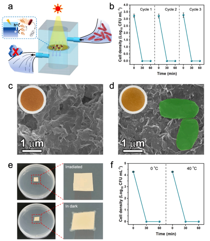 Fig 9. (a) 用于飲用水消毒的流動光催化系統示意圖。(b) ZIF-8/MXene/ZIF- 8-300 薄膜在模擬循環光催化系統中連續三個周期的飲用水消毒性能。(c-d) ZIF-8/MXene/ZIF-8-300 薄膜在飲用水消毒實驗之前(c)和之后(d)的掃描電鏡圖像(插圖:ZIF-8/MXene/ZIF-8-300 薄膜的相應光學照片)。(e) 在模擬陽光照射和黑暗條件下,ZIF-8/MXene/ZIF-8-300 薄膜上的大腸桿菌殘留量。(f) ZIF-8/MXene/ZIF-8-300 薄膜在不同溫度(0 ℃ 和 40℃)下經模擬陽光照射 60 分鐘后的飲用水消毒性能。誤差條通過重復測量三次計算得出。