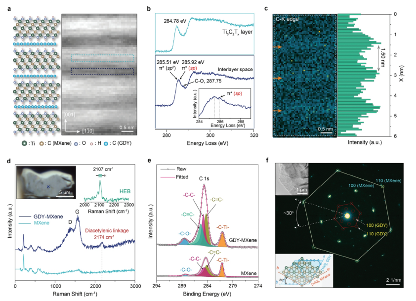 Fig 2. a) GDYMXene 沿著[110]區軸的結構模型(左)和環形暗場-STEM 圖像(右)。 b) 從 GDY-MXene 的 Ti3C2Tx 層(上)和層間空間(下)收集到的 C-K 邊 EELS 光譜,如 a) 所示。c) 根據從(a)所示區域收集的 C-K 邊沿(285.5-287.5 eV)EELS 光譜繪制的元素圖(左)和強度曲線(右),表明層間空間的碳含量較高。左側插圖是使用聚焦離子束蝕刻 GDY-MXene 晶體以暴露內部結構的光學顯微鏡圖像。十字標記表示收集拉曼光譜的位置。右側插圖是 HEB 的拉曼光譜,以作比較。e) MXene 和 GDY-MXene 的高分辨率 C 1s XPS 光譜。 f) GDY-MXene 的 SAED 圖樣,顯示出兩組六方晶格,可歸屬于取向關系為 30°的 MXene 和 GDY 結構。上插圖是獲取 SAED 圖樣的 GDY-MXene 晶體的 TEM 圖像。下插圖是一個結構模型,說明了 ML-GDY 和 MXene 之間的取向關系。