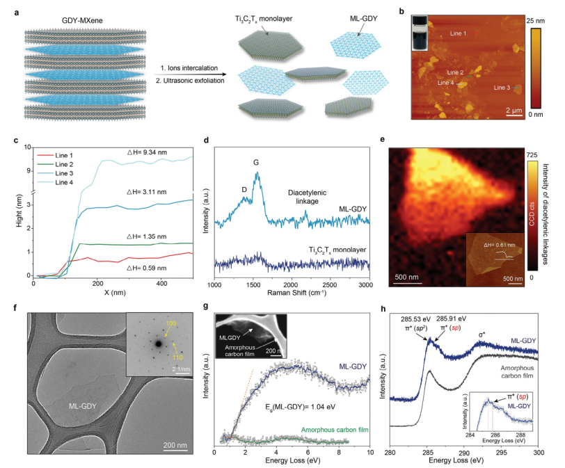 Fig 3. a) 通過離子插層輔助剝離法從 GDY-MXene 制備獨立 ML-GDY 的示意圖。 b) 剝離的 GDY-MXene 粉末的原子力顯微鏡圖像,顯示不同厚度薄片的混合物。c) (b)中四個標記薄片的原子力顯微鏡高度剖面圖。d) ML-GDY 和 Ti3C2Tx 單層薄片(使用原子力顯微鏡預先識別)的拉曼光譜。 e) 基于 2120-2230 cm-1 處信號的 ML-GDY 薄片拉曼強度圖。插圖為相應的原子力顯微鏡圖像。所示的 0.61 nm 高度對應于剖面圖中的最低值。 f) 獨立 ML-GDY 的 TEM 圖像和 SAED 圖樣(插圖)。從獨立 ML-GDY 和 TEM 網格的無定形碳薄膜上收集的低損耗 g) 和核心損耗 h) EELS 光譜。g) 中的插圖是進行 EELS 的區域的 STEM 圖像。(h) 中的插圖是 ML-GDY 的放大 EELS 光譜。