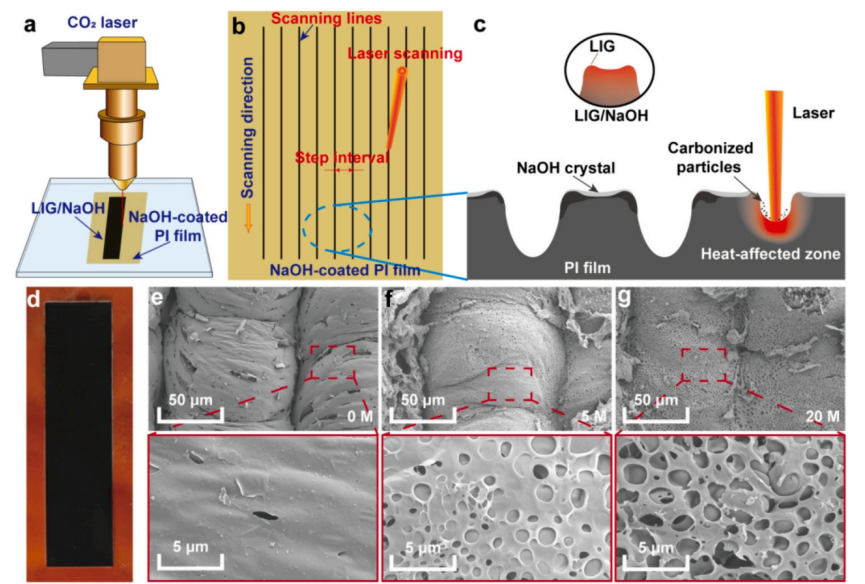 Fig 1. 使用 10.6-μm CO2 激光器通過激光劃線法制造多孔石墨烯。(a) 使用 CO2 激光在 PI 薄膜上直接刻寫以生成 LIG/NaOH 的示意圖。 (b) 激光誘導(dǎo)過程中 PI 薄膜的工藝參數(shù)。(c) 激光掃描的顯微圖像,顯示激光在 PI 薄膜上蝕刻出的溝槽結(jié)構(gòu)。溝槽頂部的無定形碳在反復(fù)激光掃描下形成石墨烯。(d) 通過激光劃線獲得的石墨烯樣品,在棕紅色的 PI 基底上可以看到黑色材料的生成。(e-g)不同濃度的 NaOH 溶液下不同尺度的 SEM 圖像:0M、5M、20M(其他濃度的 SEM 圖像見補(bǔ)充材料圖 S1)。(e)在 0 M NaOH 溶液中,沒有活化效應(yīng),樣品表面缺乏多孔結(jié)構(gòu)。(f) 5 M NaOH 時(shí),活化作用充分,石墨烯表面形成致密的多孔結(jié)構(gòu)。(g) 20 M NaOH 時(shí),活化過度,導(dǎo)致目標(biāo)表面出現(xiàn)相互連接的空隙,一些多孔結(jié)構(gòu)破碎。
