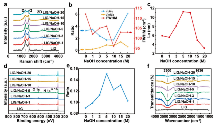 Fig 2. 用不同濃度的 NaOH 溶液處理的各種 LIG 樣品的特性。(a) 拉曼光譜,圖中標(biāo)出了 D 峰、G 峰和 2D 峰。(b) 根據(jù)圖(a)中的數(shù)據(jù)計(jì)算出的 ID/IG、I2D/IG 和 FWHM。(c) 樣品沿 a 軸(La)的晶體尺寸。(d) 不同濃度產(chǎn)品的 XPS 勘測(cè)光譜。(e) 圖(d)中不同樣品的 O/C 比。(f) 傅立葉變換紅外光譜。