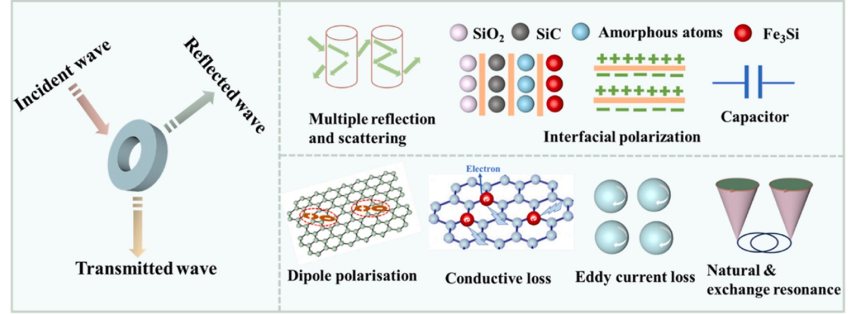 介電材料與磁性成分和微結構設計的結合已被證明是實現高效電磁波(EMW)吸收的理想方法。在此,作者通過巧妙的碳熱還原策略,成功地構建了由磁性/介電多成分構成的 Fe3Si/SiC/SiO2 復合材料。值得注意的是,所獲得的 Fe3Si/SiC/SiO2 復合材料在 1600 ℃、填充率極低的 15 wt%條件下具有出色的微波吸收性能,最小反射損耗(RLmin)為 - 64.77 dB,有效吸收帶寬(EAB)為 5.53 GHz。Fe3Si/SiC/SiO2 復合材料的高效吸收特性得益于磁介質損耗效應和阻抗匹配。多孔結構也增強了阻抗匹配,從而提高了材料的吸收能力。總之,這項研究工作為設計在多頻段/低頻段具有強吸收能力、寬吸收頻段和輕質的電磁波吸收體介紹了一種新策略。