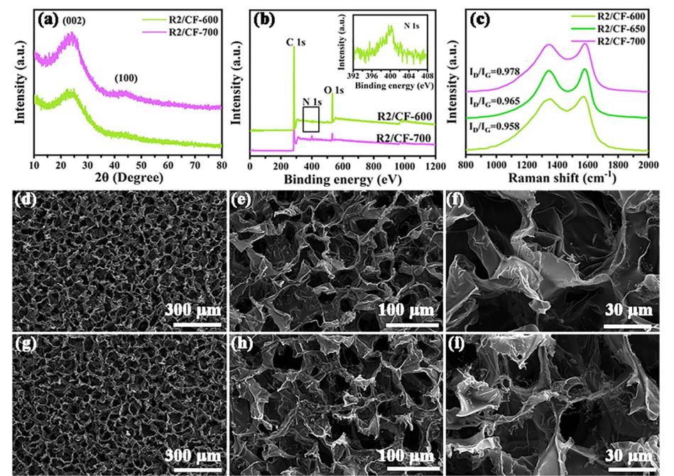 Fig 5. R2/CF-600, R2/CF和 R2/CF-700(a)XRD, (b)XPS,(c)Raman spectra, SEM圖像(d-f)R2/CF-600和(g-i)R2/CF-700。