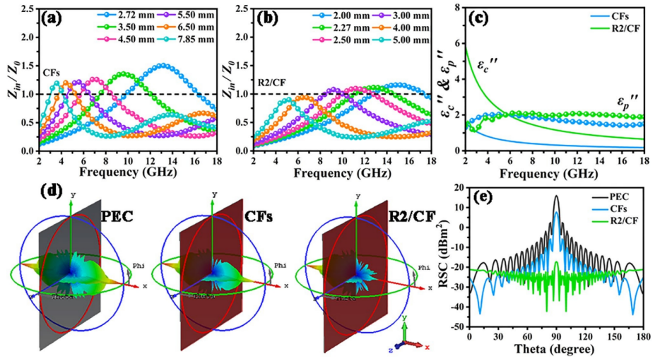 Fig 7. a-c CFs 和 R2/CF 的阻抗-f 曲線、 εc′′, εp′′ 值,以及 d、e PEC、CFs 和 R2/CF 的 3D RCS 仿真和 0-180° 入射角時(shí)的模擬 RCS 值