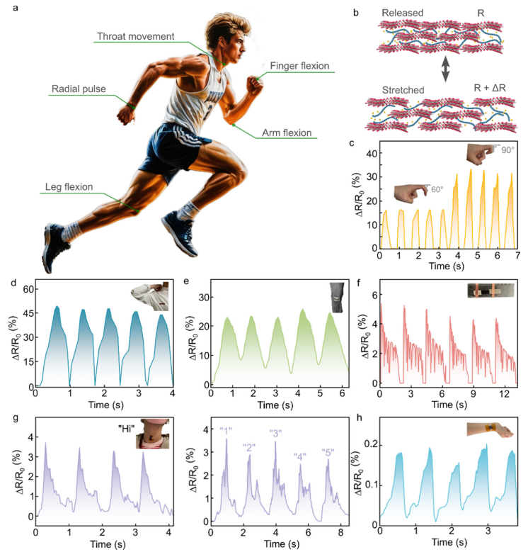 圖3. (a)說明了電子皮膚在監測不同長度尺度的不同人體運動方面的多功能性。(b)描述電子皮膚傳感機制的示意圖。(c–h)分別在手指彎曲、手臂彎曲、腿部彎曲、尺子振動、說“嗨”和“1”到“5”時喉部肌肉運動以及手腕脈搏檢測期間,電子皮膚中的實時電阻變化。