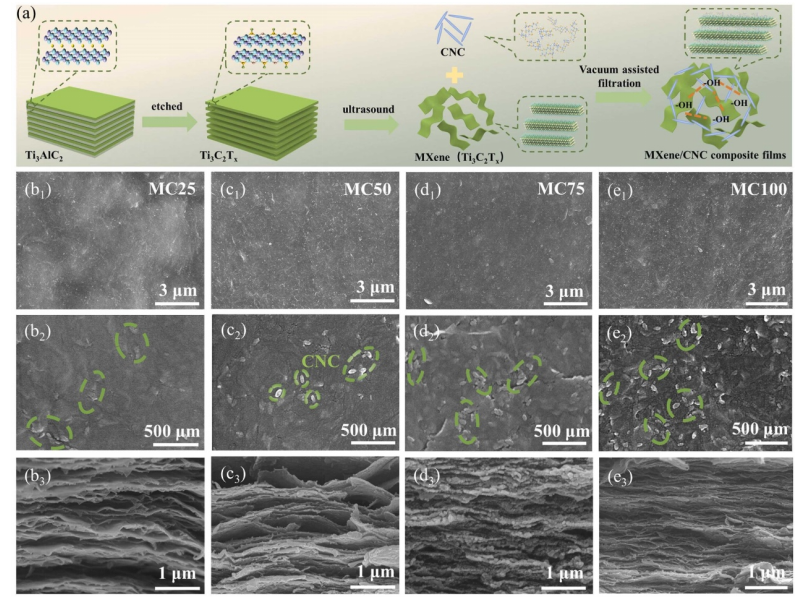 圖 1. (a)單層MXene納米片和MXene/CNC復合膜的制備工藝圖。(b1-b3) MC25、(c1-c3) MC50、(d1-d3) MC75和(e1-e3) MC100薄膜的SEM圖像。