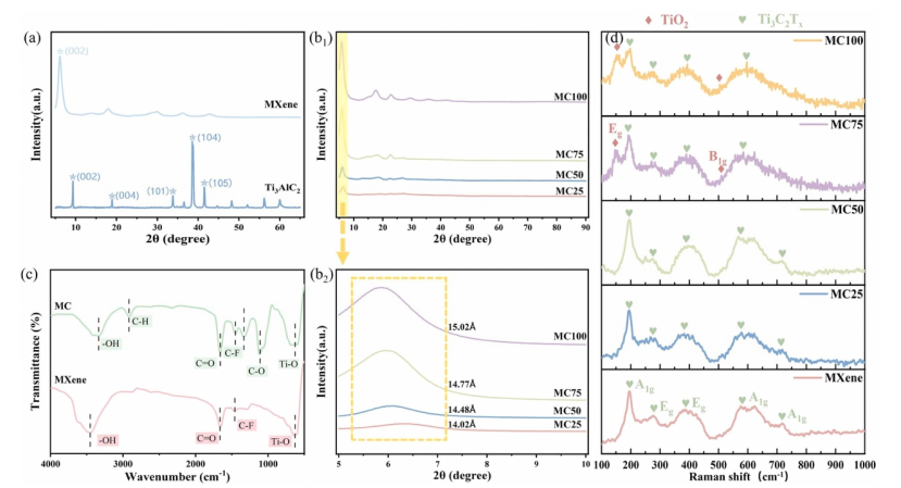圖 2. (a)ti 3 ALC 2和MXene的XRD圖,(b1)所有MC膜的全角度和(b2)小角度XRD圖,(c)MXene和MC的FT-IR曲線,和(d)MXene和MC的拉曼光譜。
