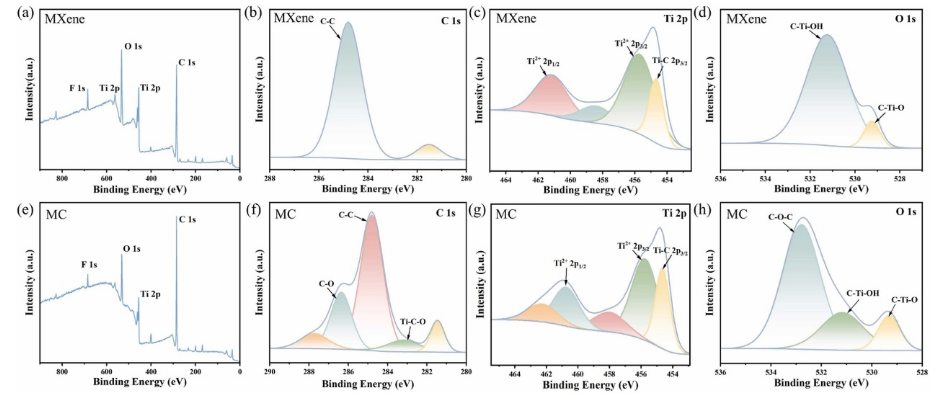 圖3. MXene的(a)全光譜、(b) C 1 s、(c) Ti 2p和(d) O 1 s的XPS光譜以及MC的(e)全光譜、(f) C 1 s、(g) Ti 2p和(h) O 1 s的XPS光譜。
