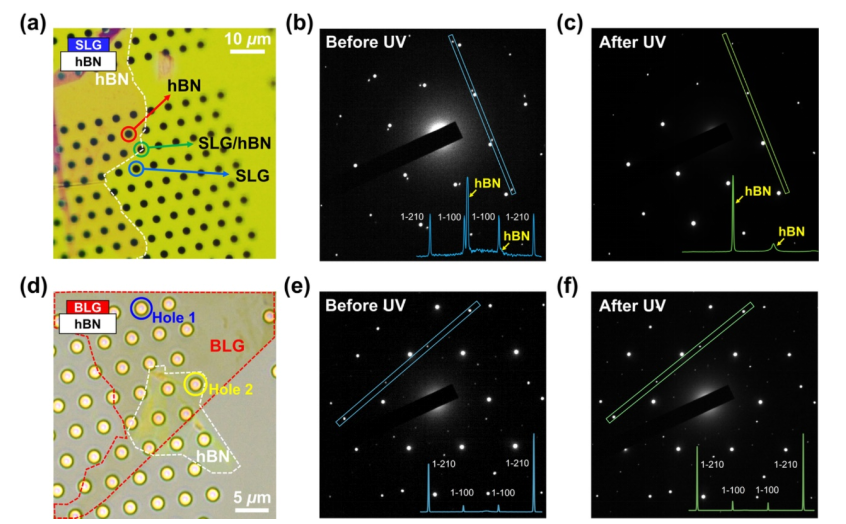 圖3. 準分子紫外輻照240 s后hBN上石墨烯的TEM表征。(a) TEM樣品制備,包括SLG、hBN和TEM網格。插圖說明了TEM網格上石墨烯/hBN的結構順序。(b,c)在(b)和(c)受激準分子UV蝕刻之前在SLG/hBN獲得的沿著指定線的代表性SAED圖案和相應的強度分布(插圖)。(d-f)與BLG/hBN的(a-c)數據集相同。孔1和孔2分別表示僅BLG和BLG/hBN結構。(e)和(f)中的代表性SAED圖案是在第2孔獲得的。