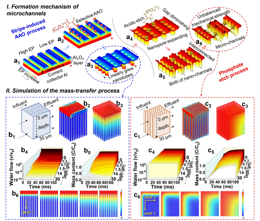 圖 5. 2D-Co/CAFE40 的結構與性能評估。(a1–a6) 通過條紋誘導 AAO 和兩步蝕刻法生長 MINAL 結構,由 COMSOL 軟件建模。(b1) 2D-Co/CAFE0 表面 (b2, b4) 水和 (b3, b5, b6) 有機溶液的傳質過程的建模與模擬。(c1) 2D-Co/CAFE40 表面 (c2, c4) 水和 (c3, c5, c6) 有機溶液的傳質過程的建模與模擬。