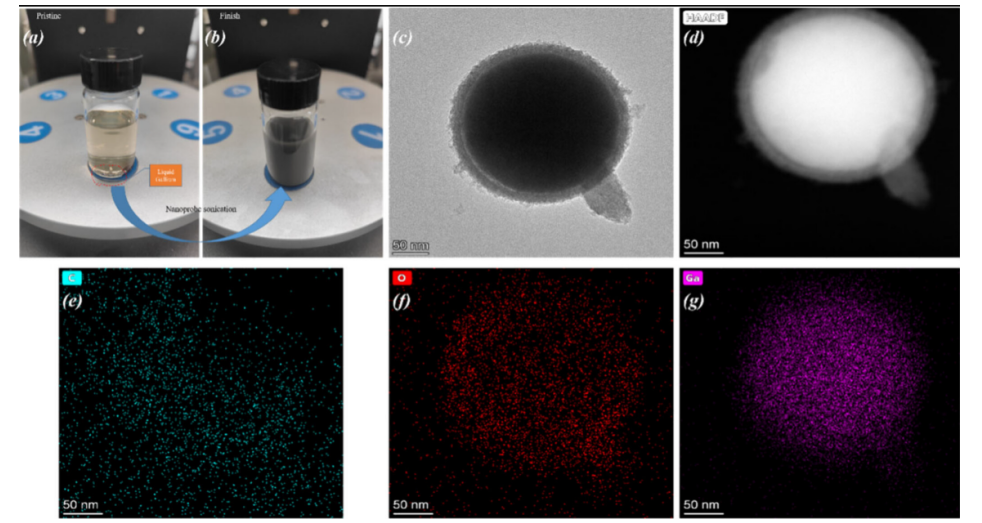 圖 1. Ga@rGO核殼結構的形貌和元素分布。(a)、(b):在超聲處理之前和之后包含液態(tài)Ga和還原的氧化石墨烯溶液的合成材料。(c)、(d):Ga @ rGO核殼粒子的HR-TEM圖像和HAADF-STEM圖像。(e)–( g):碳、氧和鎵元素的EDS圖。