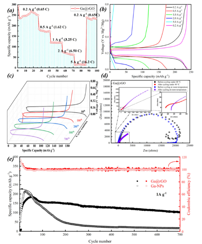 在這項工作中,通過引入還原氧化石墨烯(g a@rGO)限制的Ga核殼結構,開發(fā)了一種用于可充電鎂電池(RMBs)的自修復、高穩(wěn)定性陽極材料。通過這種Ga@rGO陽極,在室溫下以0.5a g–1的電流穩(wěn)定達到1200次循環(huán)的比容量為150 mAh g–1,在40°C稍微升高的溫度下以1a g–1的超高電流穩(wěn)定達到700次循環(huán)的比容量為100 mAh g–1。此外,陽極的超高倍率、高循環(huán)穩(wěn)定性和長循環(huán)壽命歸因于穩(wěn)定的結構;開發(fā)這種低成本、簡單且環(huán)境友好的直接滴涂(DDC)方法是為了最大化活性材料的原始狀態(tài)。值得注意的是,在超高充電電流下,陽極仍具有自愈能力。該陽極有望開發(fā)出高倍率、高穩(wěn)定性的RMBs。