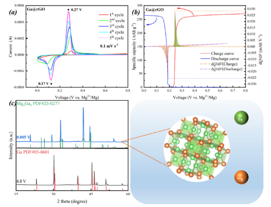 圖3. (a)以0.1mV s–1的掃描速率進行的Ga@rGO電極的典型循環(huán)伏安曲線;(b)Ga @ rGO的充電和放電曲線及其相應的dQ/dV曲線;和(c)Ga @ rGO的非原位XRD圖和Mg2Ga5的原子結構模型。