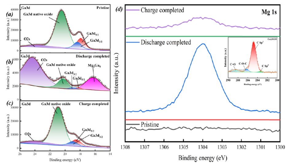 圖 4. 不同電化學狀態(tài)的Ga和Mg元素的x射線光電子能譜和相應的峰分析:(a)Ga @ rGO的原始狀態(tài);(b)放電至0.005 V的Ga @ rGO(c)充電至0.8 V的Ga @ rGO和(d)Mg元素的整個變化過程(子圖是rGO的XPS結果)。
