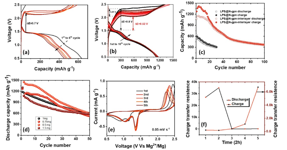 Journal of Energy Storage(https://doi.org/10.1016/j.est.2024.113389)上。原文:Reactivation of dissolved polysulfides with nitrogen doped graphene decorated carbon cloth as an effective interlayer for magnesium-sulfur battery