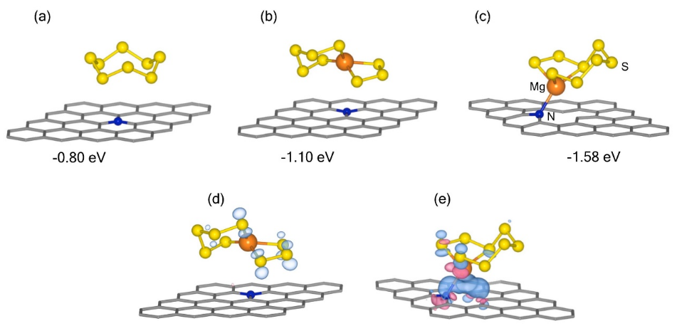 圖 5. 所研究的(a) S8和(b) MgS8在N-gpn和(c)缺陷N-gpn上吸收的結(jié)構(gòu)表示和計(jì)算的相互作用能。藍(lán)色球體代表氮原子,黃色球體代表硫原子,橙色球體代表鎂離子。灰色六邊形代表石墨烯的蜂窩晶格。MgS8在N-gpn和缺陷N-gpn上吸附的電荷密度差異分別見(d)和(e)。(對于圖例中有關(guān)顏色的解釋,請參閱本文的網(wǎng)頁版本。)