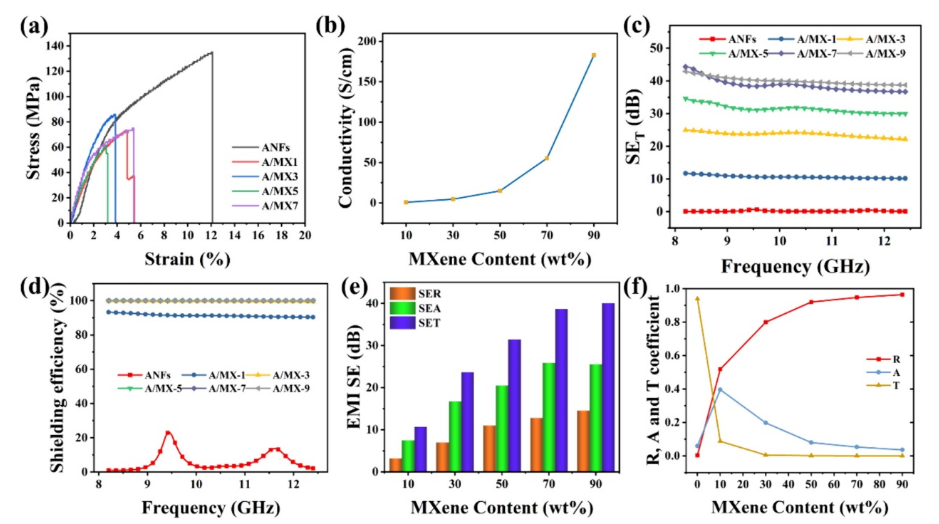 圖 2. (a)制備的具有不同MXene含量的雜化膜的典型應力-應變曲線。(b)不同雜化膜的電導率。(c) EMI SE,(d)屏蔽效率,(e) SER,SEA和SET,(f)A/MX雜化膜相對于X波段的平均R、A和T系數。