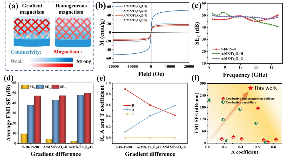 圖 4. (A)不同磁結構中的A/MX/Fe3O4雜化膜的示意圖。(b)不同A/MX/Fe3O4樣品的磁滯回線。(c)不同磁梯度結構中的A/MX/Fe3O4雜化膜的EMI SE,(d) SER,SEA,SET和(e)相對于X波段的平均R,A和T系數。(f)將最近文獻中報道的多層結構薄膜的SE/t值與本工作進行比較。