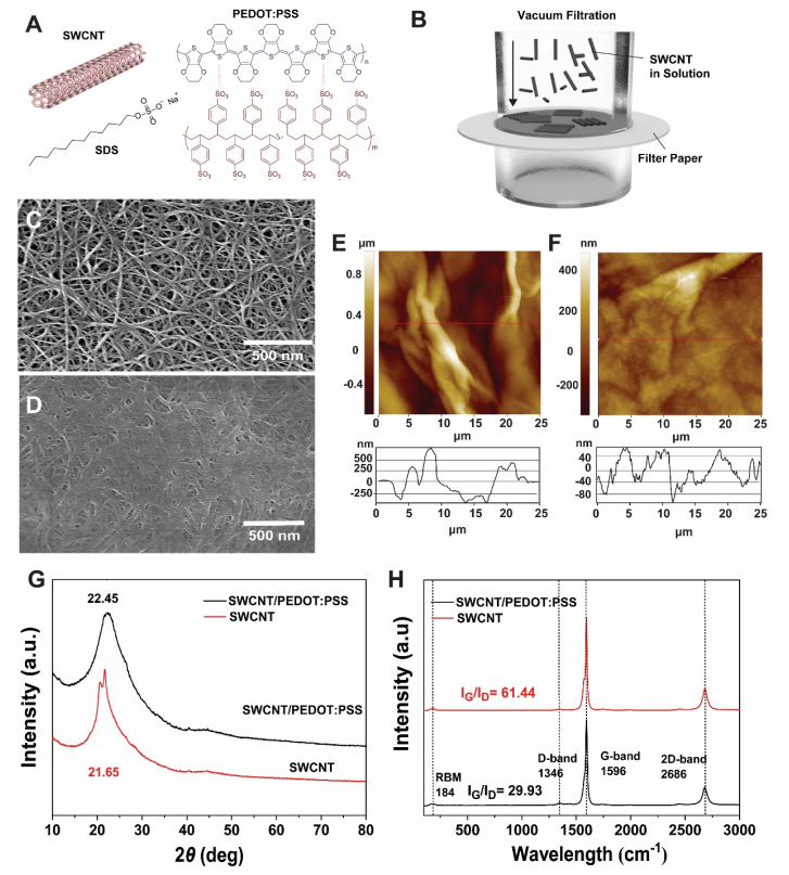 圖 1. (A)本研究中使用的swcnts、表面活性劑和PEDOT:PSS的化學結構。(B)復合膜制備示意圖。(C-D) (C) SWCNT(放大倍數為39998倍)和(D) SWCNT/PEDOT:PSS薄膜(放大倍數為25000倍)的SEM圖像。(E-F) (E) SWCNT (F) SWCNT/PEDOT:PSS復合薄膜的AFM圖像。(G)原始材料和復合材料(SWCNT/PEDOT:PSS)的XRD譜圖和(H)拉曼光譜。