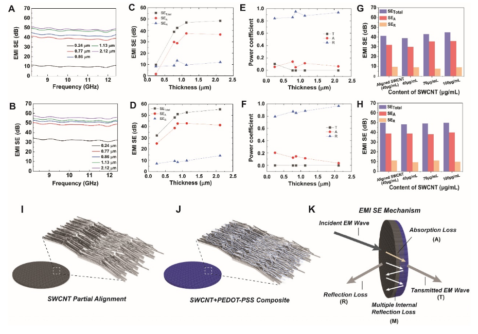 圖 2. (A)原始swcnts薄膜和(B) swcnts /PEDOT:PSS復合材料的EMI屏蔽性能。(C)原始薄膜和(D) swcnts /PEDOT:PSS復合薄膜的屏蔽作用。(E)原始膜和(F) swcnts /PEDOT:PSS復合膜的屏蔽平均系數分析。(G)原始薄膜和(H)不同進料量的SWCNT/ PEDOT:PSS復合材料的對比。(I)原始swcnts薄膜的示意圖,(J) swcnts / PEDOT:PSS復合材料,以及(K)它們的電磁干擾屏蔽機制。