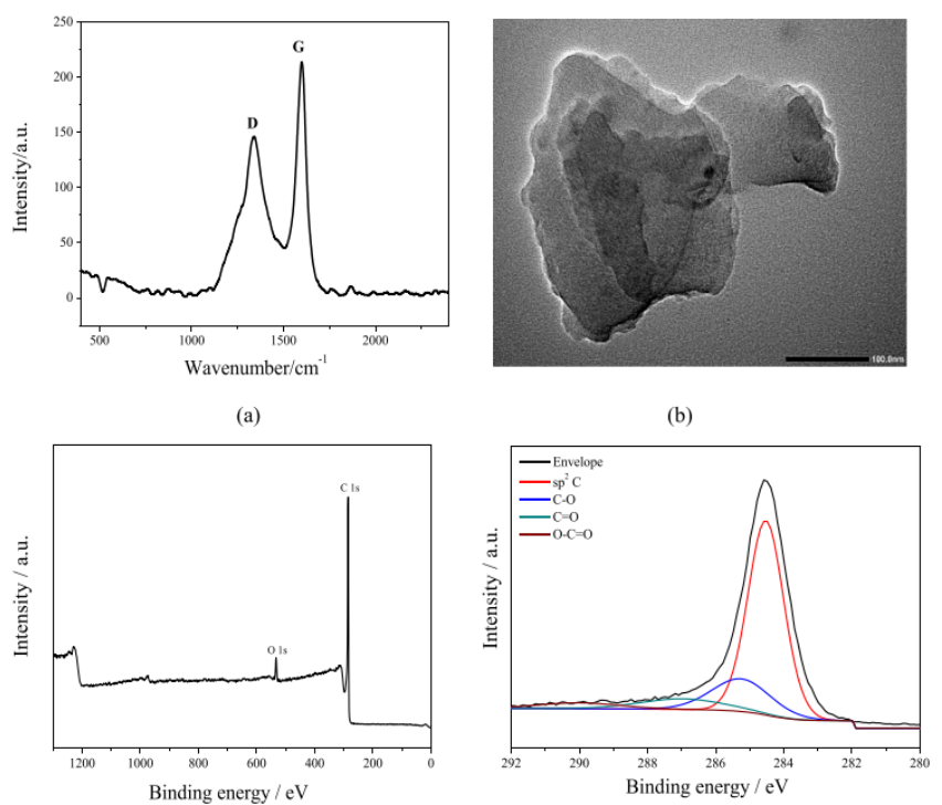 圖2. (a)GO納米片的拉曼光譜,(b) TEM圖像,(c) XPS測量光譜,(d) C1s高分辨率XPS光譜。