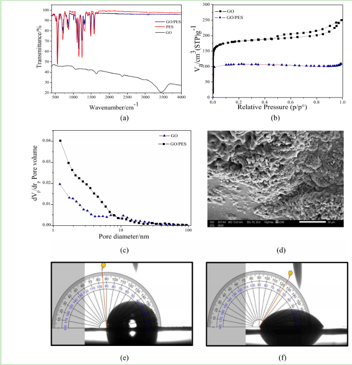 2吸附-脫附等溫線,(c)平均直徑分布,(d) SEM圖像和(e) PES、(f) GO/ PES膜的接觸角。