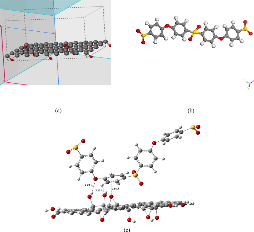 圖4. 使用DFT/GGA/PBE水平對(a)GO納米顆粒、(b)PES膜和(c)GO/ PES相互作用結(jié)構(gòu)進行計算優(yōu)化。