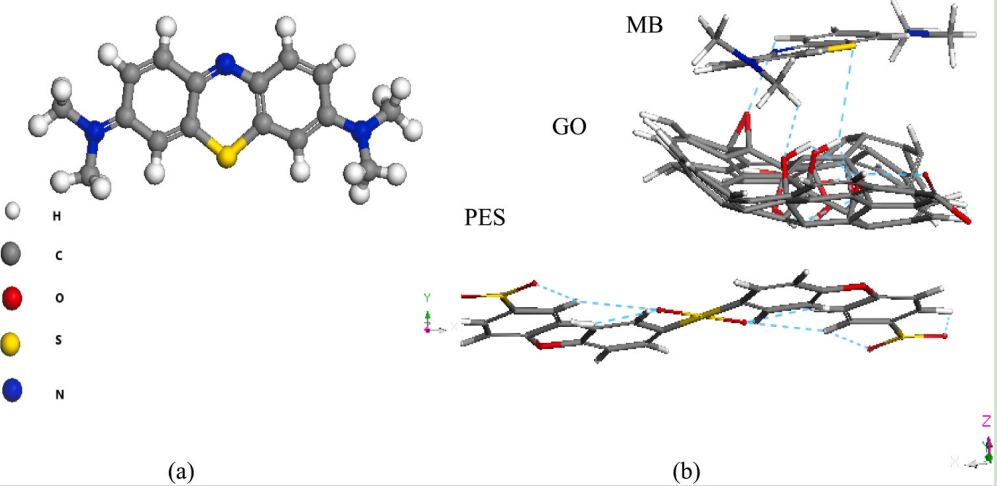 圖5. (a)基于DFT/GGA/PBE水平的MB分子計算優(yōu)化;(b)基于氫鍵距離GO/PES/MB體系模擬退火計算的分子吸附模塊。