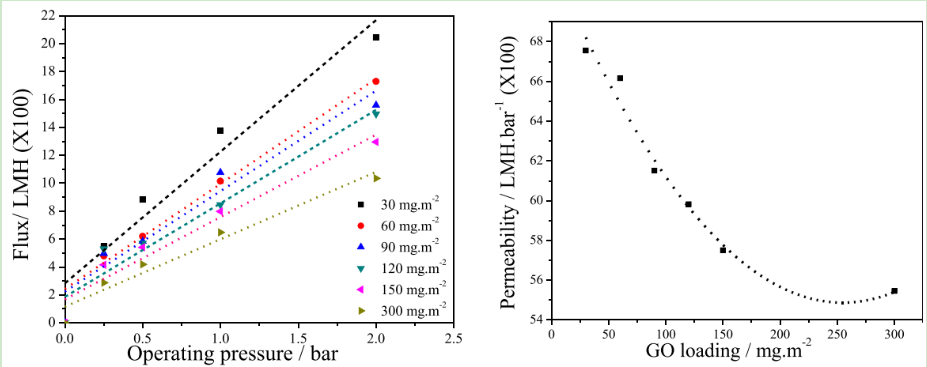 圖6. 不同GO負載下GO/PES膜的(a)通量-壓力響應性和(b)滲透性。