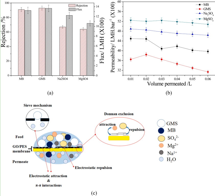 -2時GO/PES膜的滲透率。(c) GO/PES膜NF的所有相互作用機制示意圖。