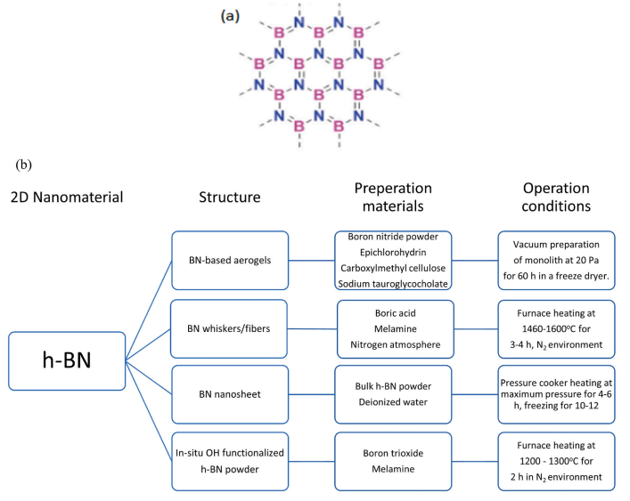 圖2. (a)六邊形氮化硼(h-BN)的分子結構,(b): h-BN合成方法和操作要求。