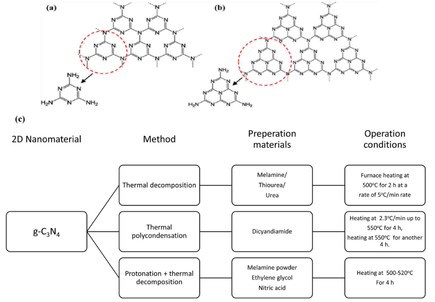 圖3. (a) g-C3N4的三嗪結構(b) g-C3N4的三-s-三嗪結構(c) g-C3N4的前體和合成方法。