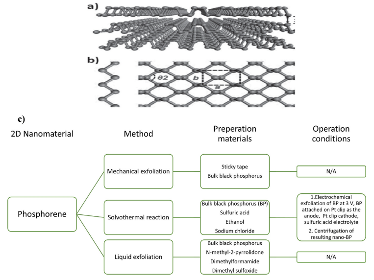 圖4. (a)三層磷烯結構,(b)單層磷烯納米片俯視圖(c)磷烯合成的前體和程序。