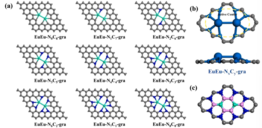 圖1. (a)不同碳氮配位催化劑的構(gòu)型。(b)活動中心的頂視圖和側(cè)視圖。(c)催化劑模型的部分演示,其中灰色代表碳,藍(lán)色代表氮而不是碳的配位,粉紅色代表從空位缺陷中移除的原子,淺綠色代表摻雜的稀土原子銪。