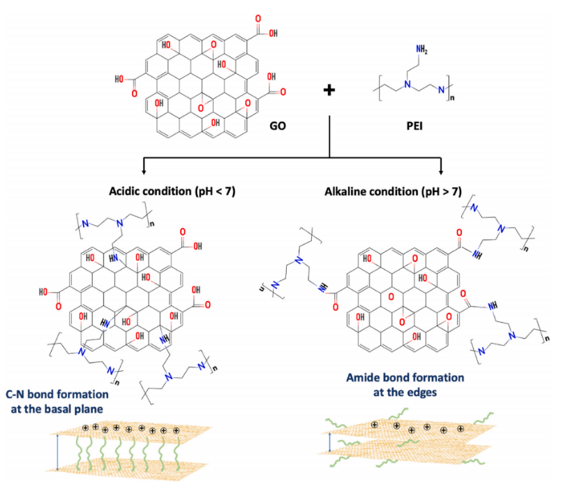 圖3. 提出了GO和PEI在酸性和堿性條件下的反應機理。
