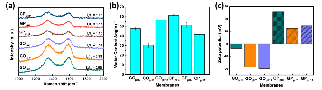 圖5. pH 調節的 GO 和 GP 膜的(a) 拉曼光譜、(b) 水接觸角、以及 (c) zeta 電位。