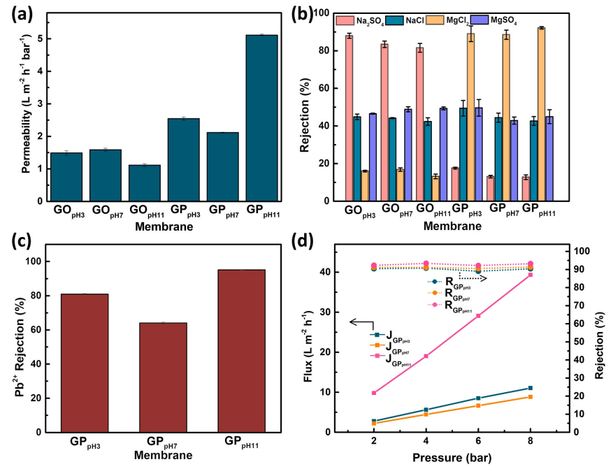 圖6. 采用 pH 調節膜的納濾結果:(a)純水滲透性,(b)對四種常見無機鹽的分離性能,(c)對金屬離子的排斥性能,(d)操作壓力變化。