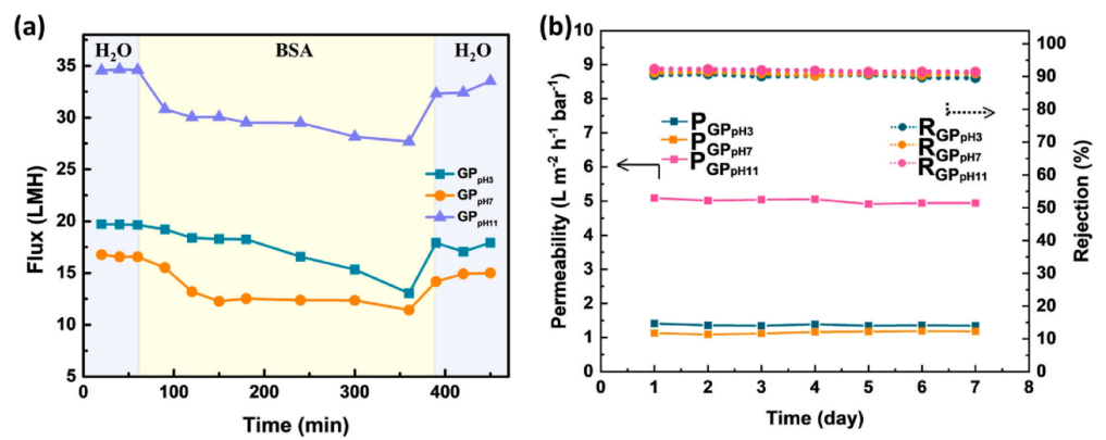 圖8. (a) pH 調節 GP 膜的防污性能及其 (b) 長期運行中的穩定性。