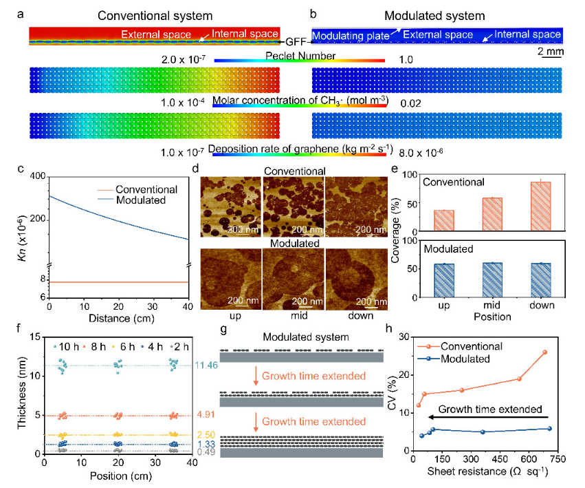 Fig 2. 流體動力學(xué)模擬和石墨烯在 GFF 上沿著 CVD 系統(tǒng)中的氣流進(jìn)行 CVD 生長。 (a,b) 傳統(tǒng)(a)和調(diào)制(b)系統(tǒng)中佩克雷特?cái)?shù)(上)、CH3? 摩爾濃度(中)和石墨烯沉積速率(下)的分布圖。 (d,e)在 GGFF(尺寸:40(長)×5(寬)×0.015(厚)cm)上氣流的上、中、下流處獲得的原子力顯微鏡圖像(d),以及相應(yīng)的石墨烯覆蓋率統(tǒng)計(jì)(e)。 生長條件: 1373 K,常壓,CH