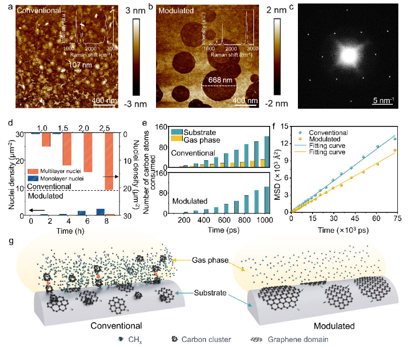 2 = 20/100 sccm,1-8 h。 (e) MD 模擬統(tǒng)計(jì)了氣相中和基底上反應(yīng)消耗的碳原子數(shù)量。 (f) 反應(yīng)進(jìn)行時基底上碳原子的均方距離的 MD 模擬統(tǒng)計(jì)。 (g) 傳統(tǒng)(左)和調(diào)制(右)系統(tǒng)中石墨烯 CVD 生長示意圖。
