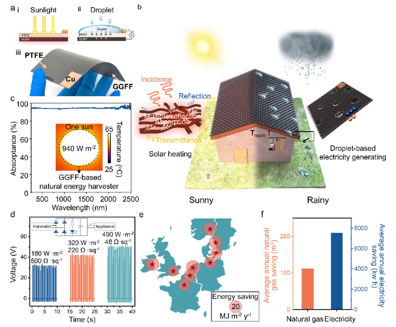 Fig 6. 基于 GGFF 的自然能源收割機(jī),具有太陽能加熱和液滴發(fā)電(DEG)功能。 (a) 基于 GGFF 的自然能源收集器在晴天(i)和雨天(ii)工作的示意圖,以及收集器的照片(iii)。 (b) 用于建筑供暖以節(jié)約能源的能量收集器概念設(shè)計(jì)。 (c) 基于 GGFF 的自然能源收集器的太陽吸收光譜。 GGFF 的片電阻為 ∼48 Ω sq