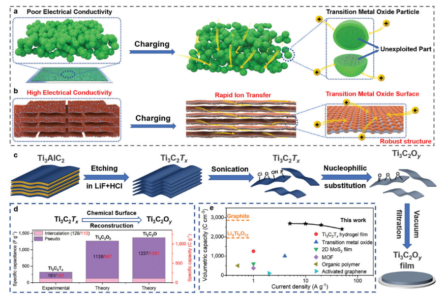 Fig 1. a,b) 傳統顆粒狀過渡金屬氧化物與具有類過渡金屬氧化物表面二維材料的電容存儲示意圖。c) 親核取代構建全氧表面MXene (Ti