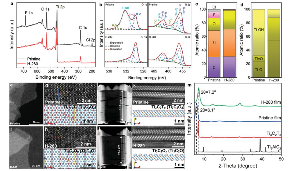 x (g) 和 H-280 (h) 薄膜的 HAADF STEM 圖像。i-l) 通過 FIB 解剖的原始 Ti