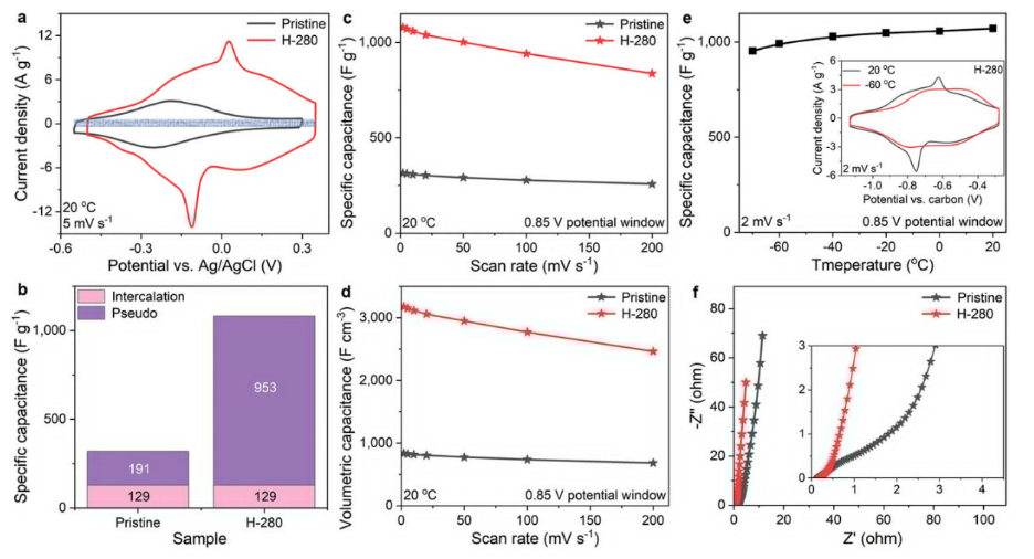 x 和 H-280 薄膜電極收集的電化學阻抗譜數據。 插圖顯示高頻范圍。為了方便比較,這兩個薄膜電極的插層電容是統一的,這不會影響 H-280 薄膜電極的偽電容急劇上升的事實。