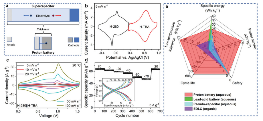 -1的恒流循環期間隨溫度的變化。插圖描繪了不同溫度下的恒電流充放電曲線。e) 本工作中的質子電池(器件級)與鉛酸電池、偽電容器和有機電解質中的 EDLC 的綜合比較。