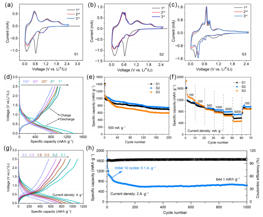 −1掃速下的CV曲線;(d)S2的GCD曲線;S1、S2和S3的(e)循環穩定性和(f)倍率性能。(g)不同電流密度下S2的GCD曲線。(h)S2在2A·g