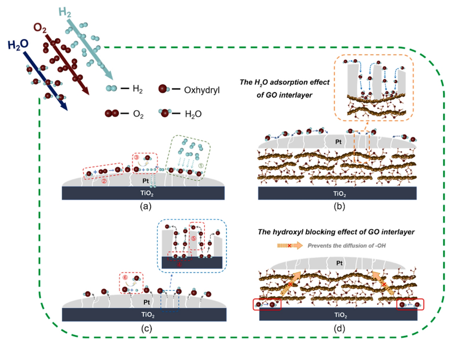 圖8. (a) 由于 Pt 表面吸附了 H2O,潮濕空氣中的 H2 響應降低。(b) 由于 GO 夾層的 H2O 吸附作用,H2O 分子從 Pt 表面擴散到具有優異 H2O 吸附能力的 GO 夾層。(c) TiO2 表面生成了 –OH 物質使得潮濕空氣中的 H2 響應降低。(d) GO 夾層的羥基阻斷作用可防止 –OH 從 TiO2 向 Pt 層擴散。