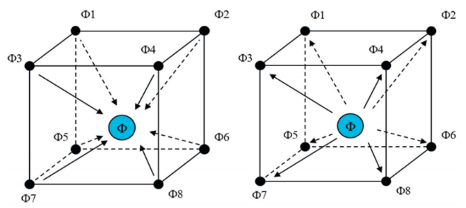 圖2. 流體量的體積插值(左)和顆粒量的體積加權平均(右)。